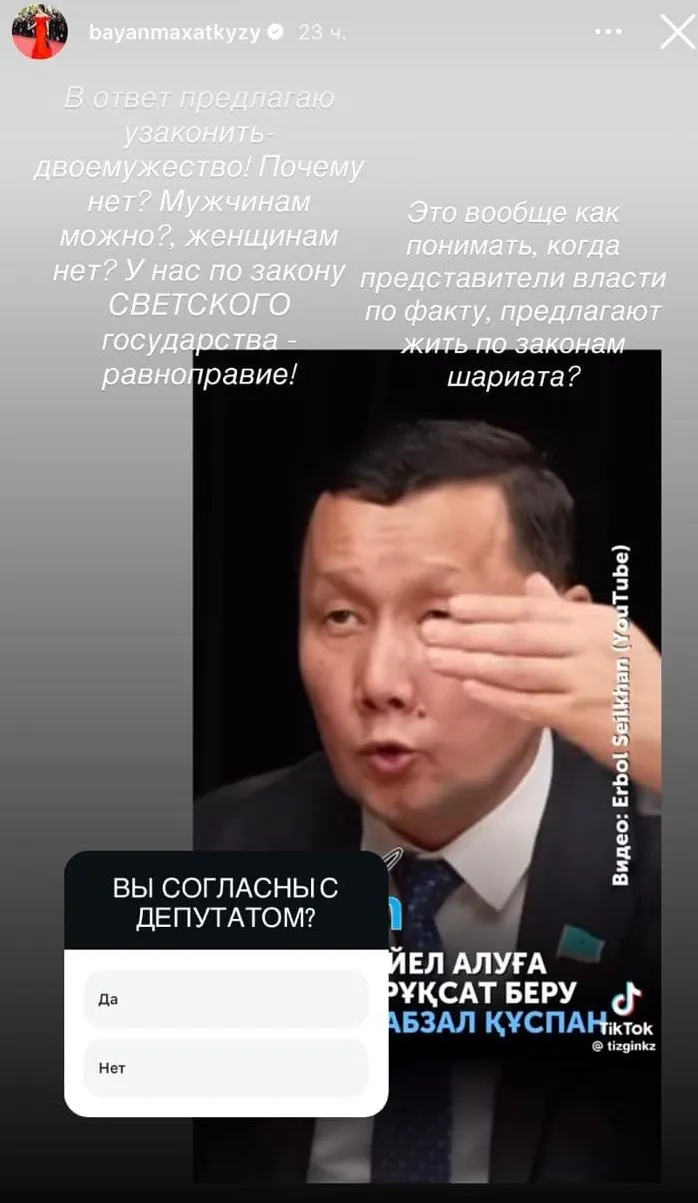 В свою очередь политический деятель, блогер и бывший депутат Мажилиса Танирберген Бердонгаров предложил обсудить казахстанцам инициативу Баян Алагузовой о легализации многомужества.