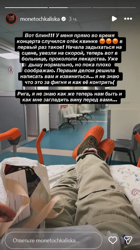 "У меня прямо во время концерта случился отек Квинке... В первый раз такое! Начала задыхаться на сцене, увезли на скорой, теперь вот в больнице, прокололи лекарства. Уже дышу нормально, но пока плохо соображаю. Первым делом решила написать вам и извиниться", – написала певица.