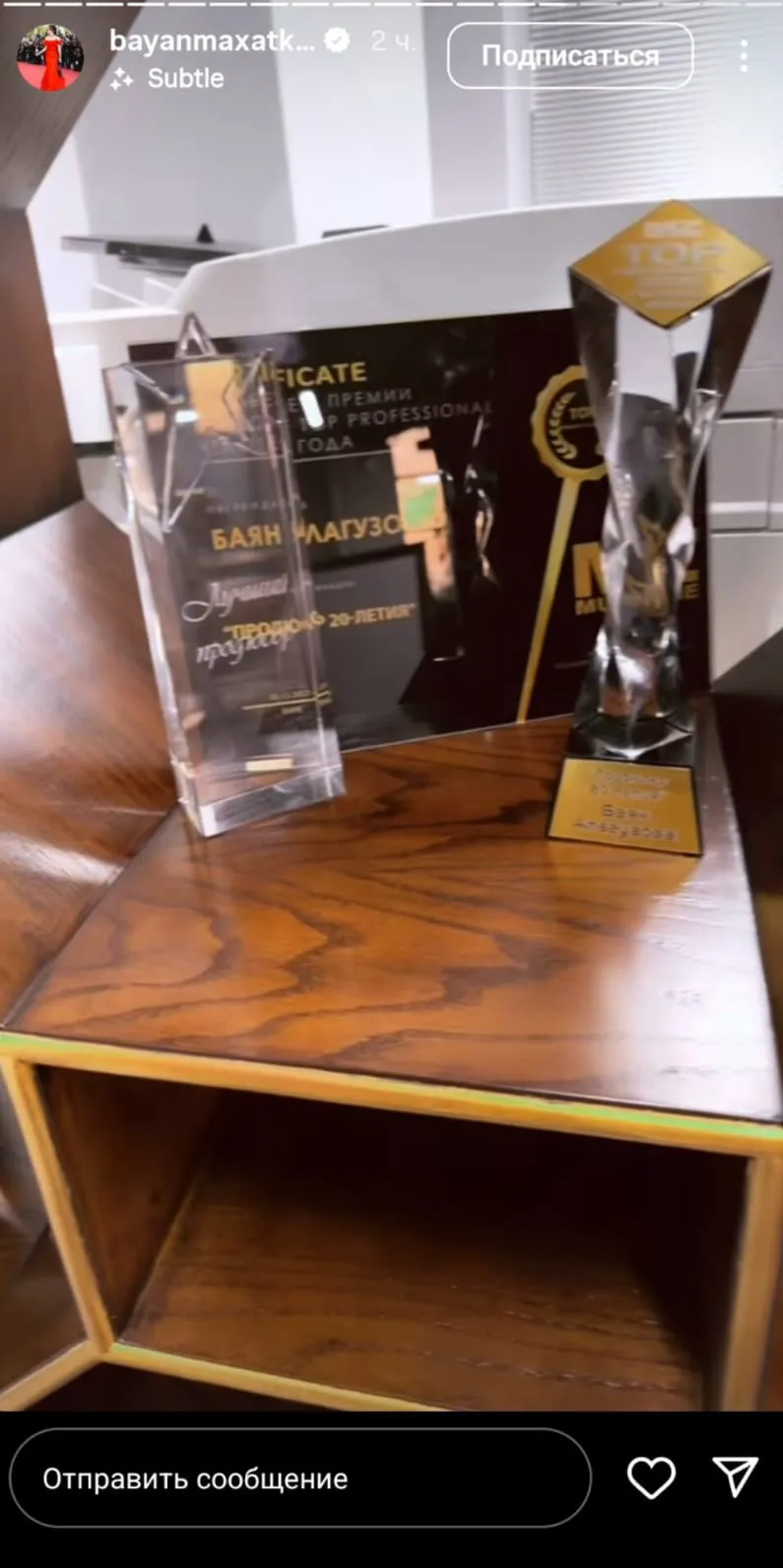 "От телеканала Muzzone получила награду. Кстати, поздравляю их с 20-летием. Я получила номинацию "Продюсер 20-летия", представляете?" – делится с подписчиками Алагузова.