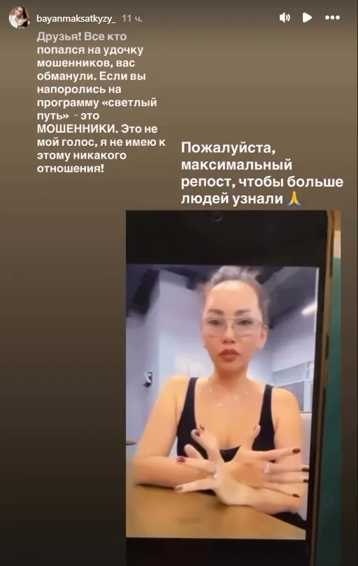 На своей странице в Instagram в сторис она опубликовала видео, на котором якобы рассказывает о работе над новым проектом при поддержке программы "светлый путь" и Минтруда, который позволит улучшить жизнь казахстанцев.