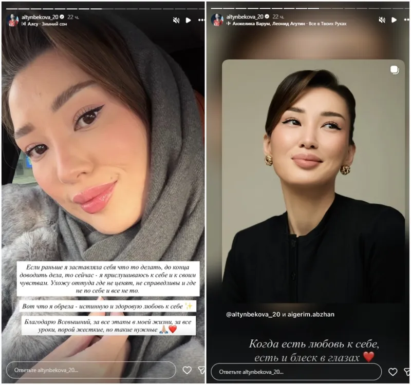 В Stories Алтынбекова пояснила, что раньше заставляла себя что-то делать, до конца доводить дела, а сейчас она прислушивается к себе и к своим чувствам.