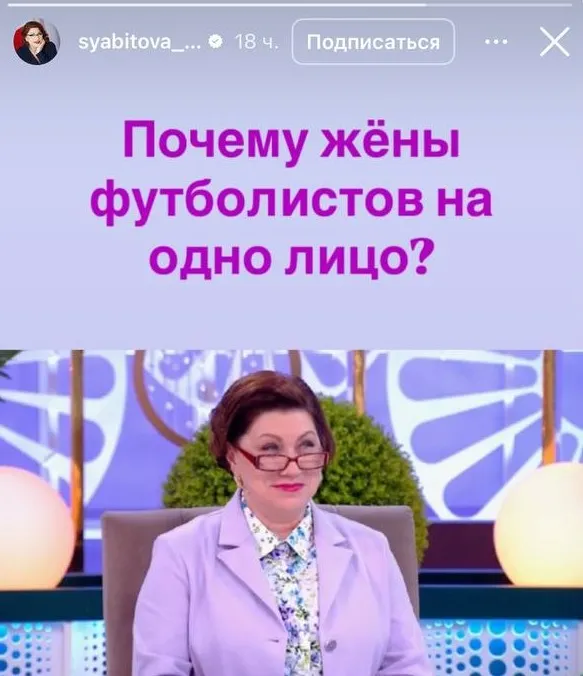 Свойственную ей прямолинейность Сябитова обозначила 18 марта на своей странице в Instagram. Со слов телеведущей, так она решила ответить на недавно заданный ей вопрос, по поводу жен футболистов, которые похожи друг на друга, как из инкубатора.