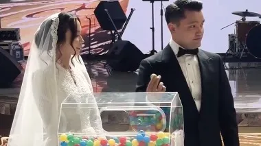 На кадрах, разлетевшихся в социальных сетях, видно, что молодожены организовали для приглашенных специальный интерактив. Участники выбирали разноцветные шары из лототрона, с помощью которых и определился победитель.
