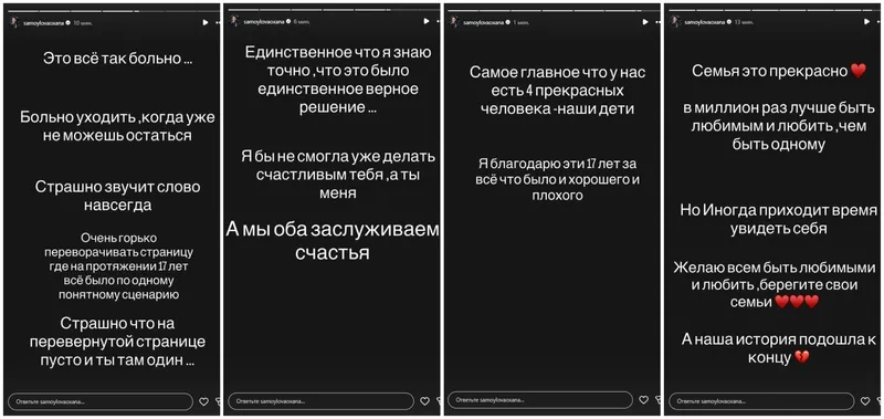 "Больно уходить, когда уже не можешь остаться. Страшно звучит слово навсегда. Очень горько переворачивать страницу, где на протяжении 17 лет все было по одному понятному сценарию. Страшно, что на перевернутой странице пусто и ты там один... Единственное, что я знаю точно, что это было единственное верное решение... Я бы не смогла уже делать счастливым тебя, а ты меня. А мы оба заслуживаем счастья", – заявила блогер.