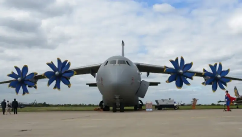 Ан-70 - военно-транспортный самолет короткого взлета и посадки, в том числе с необорудованных взлетно-посадочных полос. Самолет развивает скорость свыше 750 км/ч и совершает перелеты на расстояние до 7,8 тысячи километров. Грузоподъемность Ан-70 составляет 47 тонн.