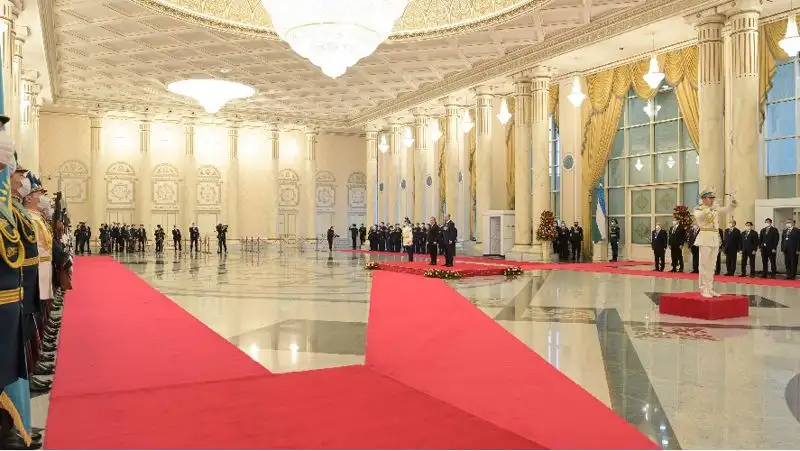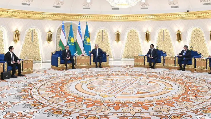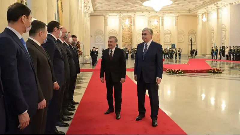 Переговорам предшествовала официальная церемония встречи во дворце Акорда. После того как начальник роты Почетного караула отдал приветственный рапорт президентам, прозвучали государственные гимны двух стран. Касым-Жомарт Токаев и Шавкат Мирзиёев совершили обход Почетного караула. Затем в Восточном зале состоялась встреча в узком составе.