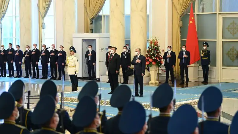 Торжественная церемония встречи председателя КНР состоялась в резиденции "Акорда". Начальник Почетного караула отдал рапорт лидерам двух стран, были исполнены государственные гимны Казахстана и Китая.