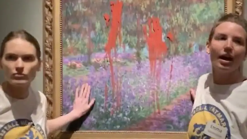 Экоактивисты размазали краску по "Саду художника в Живерни" французского импрессиониста. Активисты кричали "климатическая ситуация острая" и "наше здоровье под угрозой".