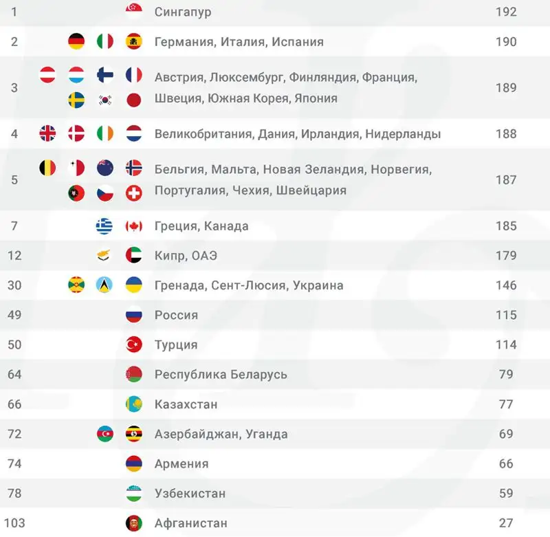 На второе место поднялись Германия, Италия и Испания (190 стран), на третьем помимо Японии оказались Австрия, Люксембург, Финляндия, Франция, Швеция и Южная Корея (189 стран).