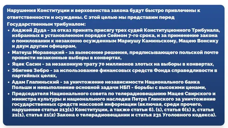 "Поставить перед государственным трибуналом Анджея Дуду (президент Польши), Матеуша Моравецкого (премьер-министр), Яцека Сасина (министр государственных активов), Збигнева Зибро (министр юстиции, генеральный прокурор), Адама Глапинского (глава Национального банка), Мачея Свирского (глава национального совета по телевидению и радиовещанию), Петра Глиньского (министр культуры и национального наследия)", — говорится в предвыборной программе "Гражданской платформы".