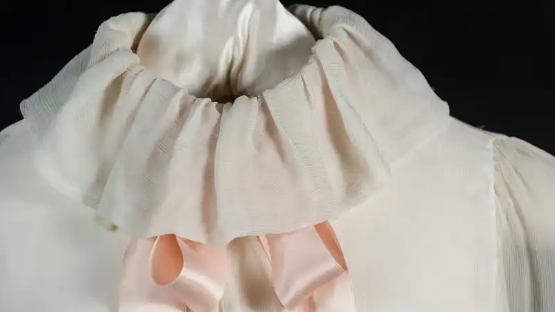 Розовая креповая блузка с воротником в форме рюша и свободными складками спереди, которую носила Диана, была запечатлена королевским фотографом лордом Сноудоном и выставлена на продажу на аукционе Julien's Auctions.