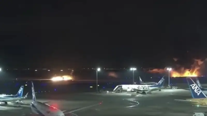 Самолет Japan Airlines загорелся в аэропорту Токио при посадке. На видео видно, как пламя охватило весь самолет. Позже выяснилось, что причиной возгорания самолета Airbus A350 авиакомпании Japan Airlines оказалось столкновение с самолетом береговой охраны.