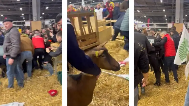 BREAKING – France: Farmers spread tensions inside the agricultural show in Paris this morning as Macron visits the fair. The situation is totally out of control! #France #farmersprotests2024 pic.twitter.com/FHLtWIJ9df