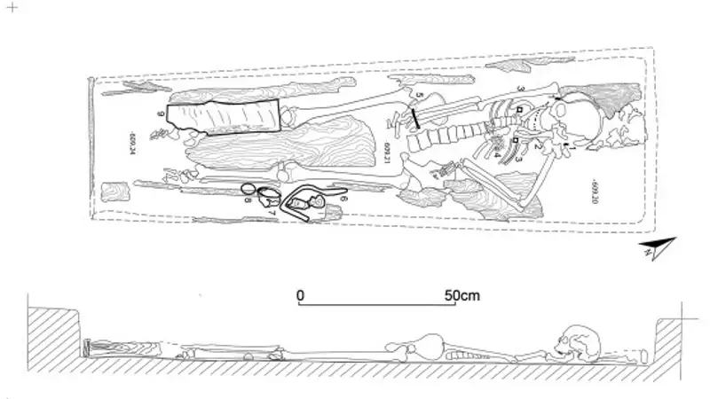"Скелет взрослой женщины в возрасте от 40 до 60 лет, одетой в желтый шелковый плащ, был найден внутри деревянного гроба. Она принадлежала к элите, о чем свидетельствуют золотые серьги, серебряная чаша, бронзовый сосуд, золотой браслет, коралловые и стеклянные бусины, найденные в гробнице. Шелк, вероятно, был изготовлен в Южном Китае", – сообщают ученые.
