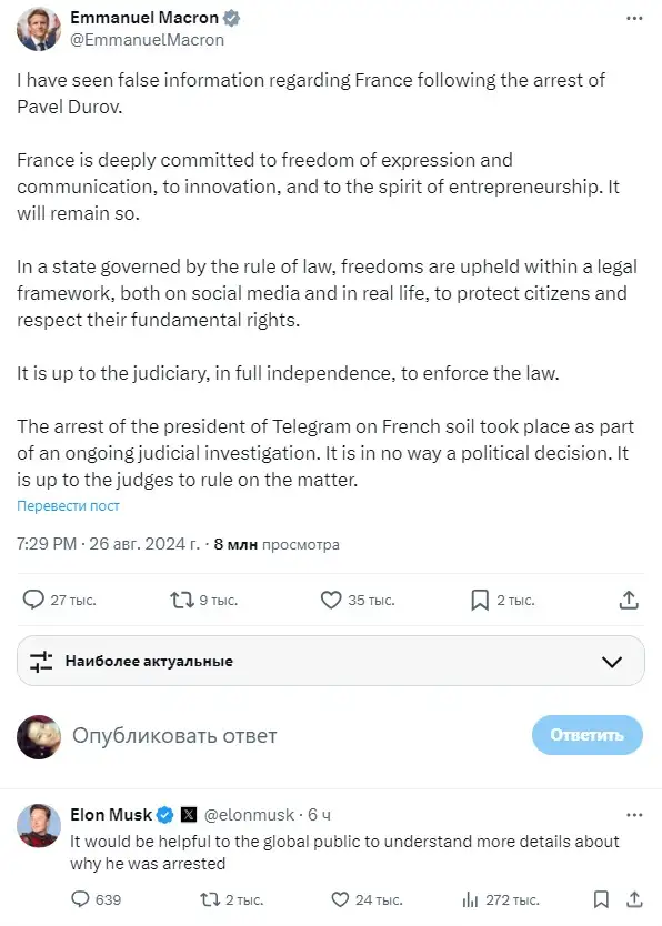 "Для мировой общественности было бы полезно узнать больше подробностей о том, почему он был арестован", – написал сегодня Илон Маск под публикацией Эммануэля Макрона.