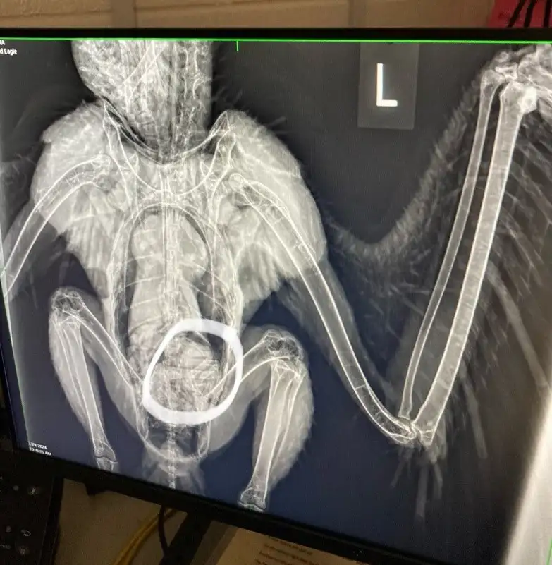 Однако рентген показал, что орлан абсолютно здоров, а летать не может по другой причине. Оказалось, что он съел целого енота.