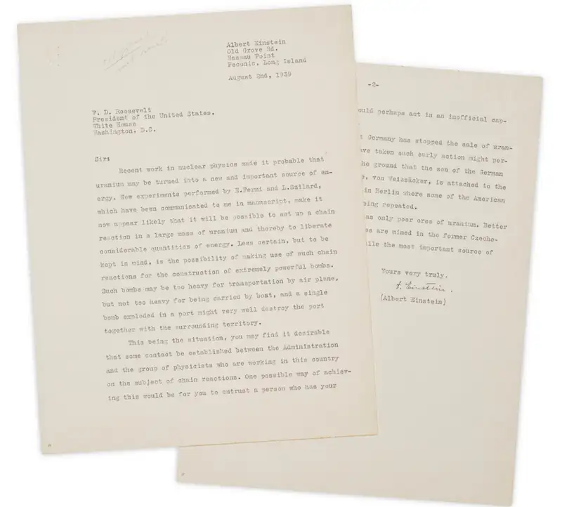 По данным аукционного дома, в письме ученый предупреждал американское руководство о начале ядерных исследований нацистской Германии. Эйнштейн вместе со своим коллегой Лео Силардом сообщил 32-му президенту Соединенных Штатов об угрозе создания Германией "чрезвычайно мощных бомб". Сейчас оригинал документа хранится в президентской библиотеке в Нью-Йорке.