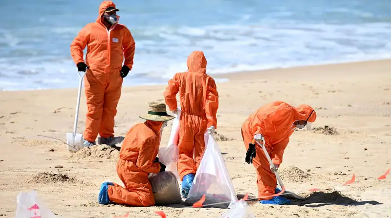 Ранее сообщалось, что потенциальное нефтяное пятно обнаружили у пляжа Куджи в Сиднее после того, как на берег выбросило загадочные черные шары.