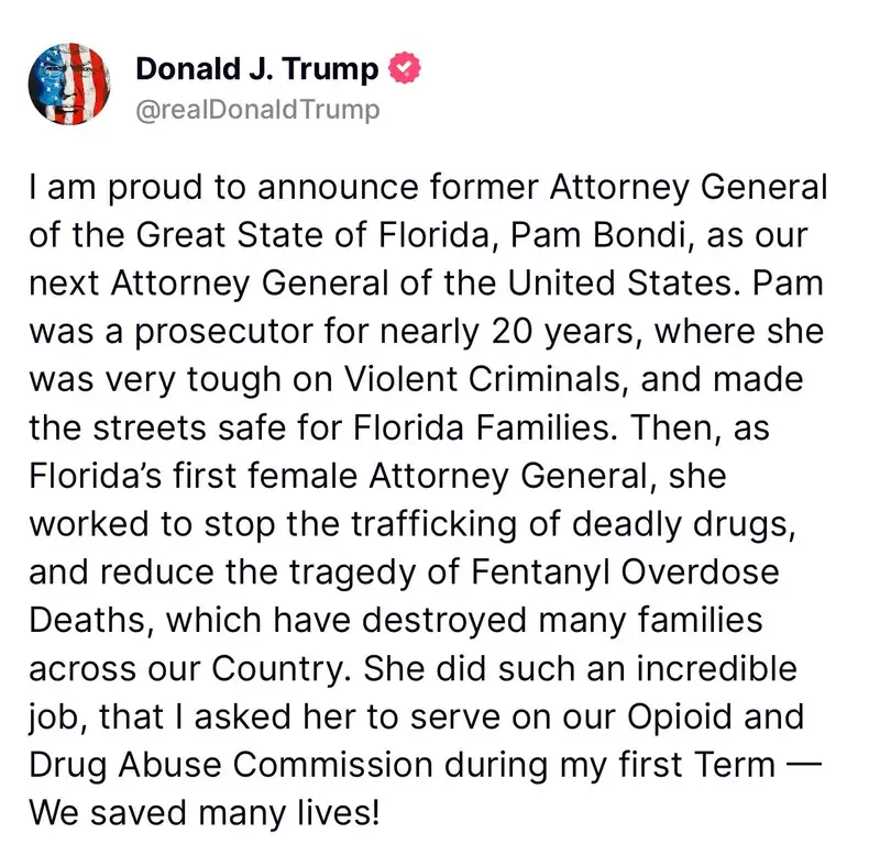 Спустя несколько часов после заявления Гетца, Трамп назвал новую кандидатуру на пост генпрокурора США. Ею стала Пэм Бонди – адвокат Трампа. В 2020 году она была в составе адвокатов во время судебных разбирательств, связанных с импичментом.