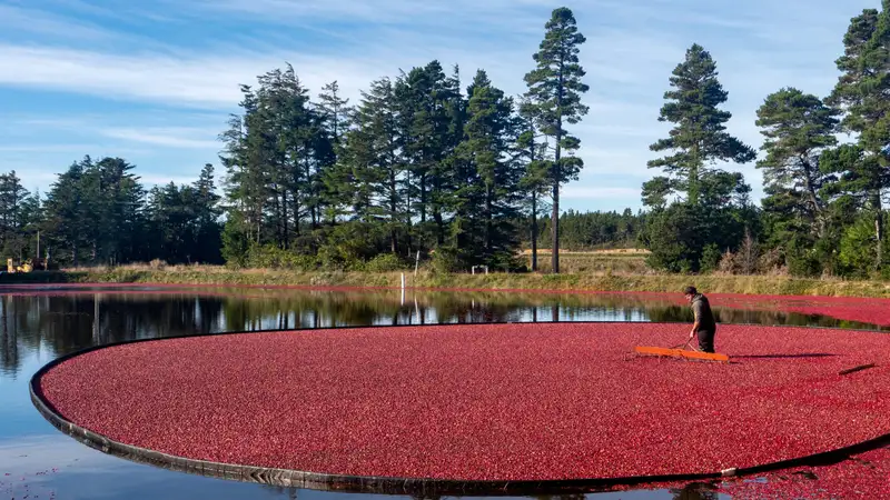 Местные болотные растения, дающие плоды клюквы, начинают расти в мае. Когда они готовы к сбору, фермеры заливают болота водой и отправляют машину, чтобы собрать урожай.