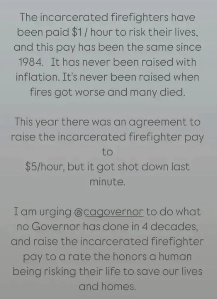 Кардашьян уточнила, что пожарные из числа узников тюрем работают посменно по 24 часа в сутки, а их зарплата не менялась последние 40 лет. Выяснилось, что данная программа существует с 19-го века. Селебрити добавила, что недавно обсуждалась программа по повышению платы заключенным-пожарным до пяти долларов в час, но, по ее словам, "она была прикрыта в последнюю минуту".