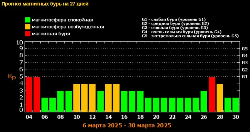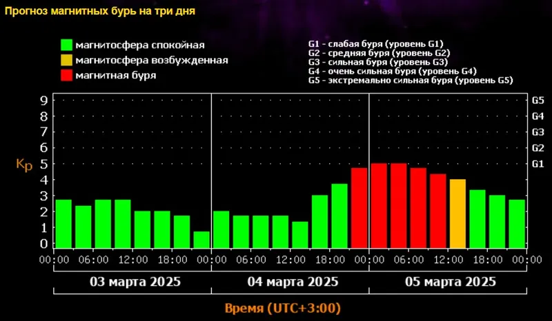 Уже в ночь на 5 марта возмущения достигнут класса магнитной бури уровня G1. При этом уже к вечеру среды магнитное поле Земли вновь станет спокойным.