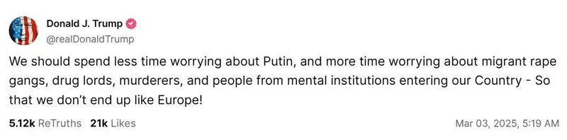 3 марта президент США Дональд Трамп посоветовал американцам беспокоиться из-за миграционных преступников, а не из-за президента России Владимира Путина, сообщает Zakon.kz.
