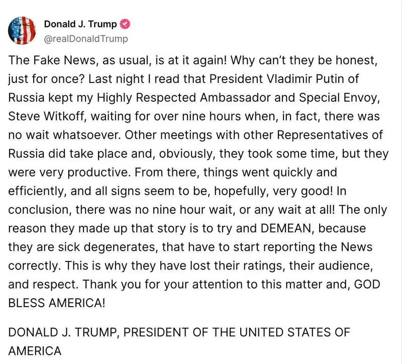"Фейковые новости, как обычно, снова за свое! Почему они не могут быть честными хотя бы раз? Вчера вечером я прочитал, что президент России Владимир Путин заставил моего глубоко уважаемого посла и специального посланника Стива Уиткоффа ждать более девяти часов, тогда как на самом деле никакого ожидания не было вообще", – отреагировал Трамп.