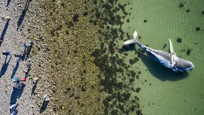 По словам очевидцев, туша кита лежит на спине у кромки воды с 1 апреля. Место уже облюбовали местные жители и любопытные туристы, пишет The Local.