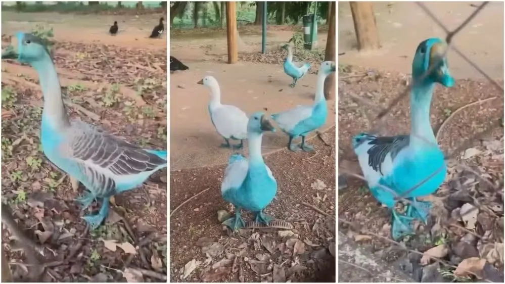 Patos e gansos ficam azuis após carreta bater em poste e derramar corante em córrego no interior de SP.