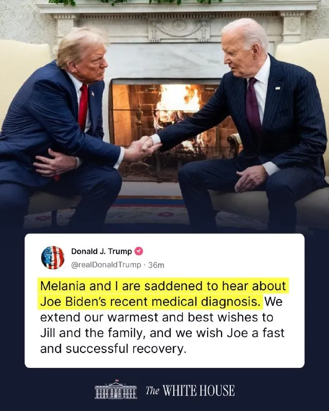 "Мы с Меланией опечалены недавним медицинским диагнозом Джо Байдена. Мы выражаем самые теплые пожелания супруге экс-президента Джилл и его семье и желаем Джо скорейшего и успешного выздоровления", – написал он на своей странице в Х.