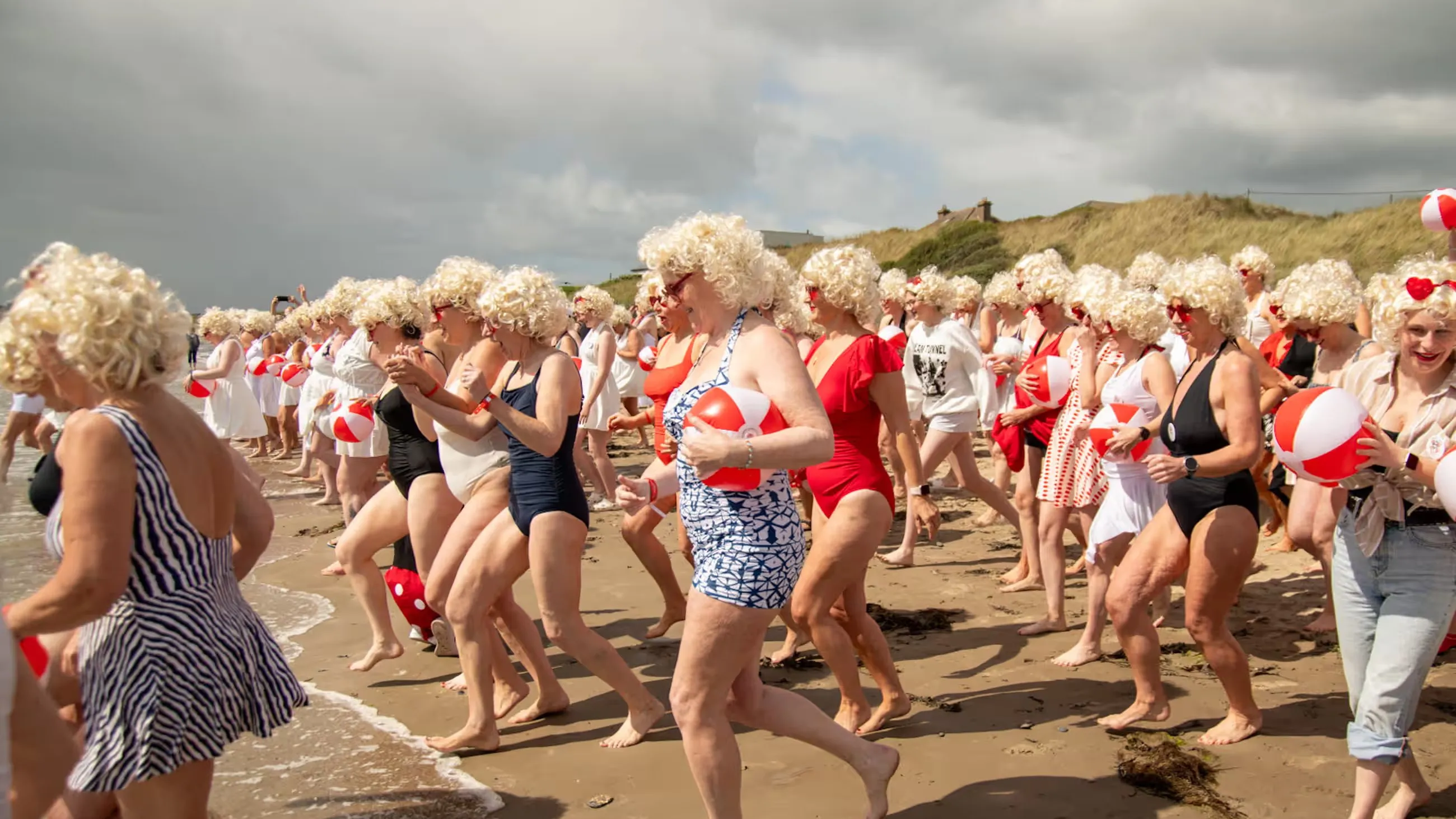Пловцы в ретрокупальниках и светлых париках, одетые как кинозвезда, окунулись в воду на пляже Балкаррик в Донабате, графство Дублин.