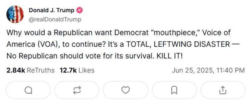 16 марта 2025 года "Голос Америки" и "Радио Свобода" приостановили работу после решения Агентства США по глобальным медиа (USAGM) прекратить их финансирование. Это произошло из-за указа Трампа о сокращении государственных расходов.