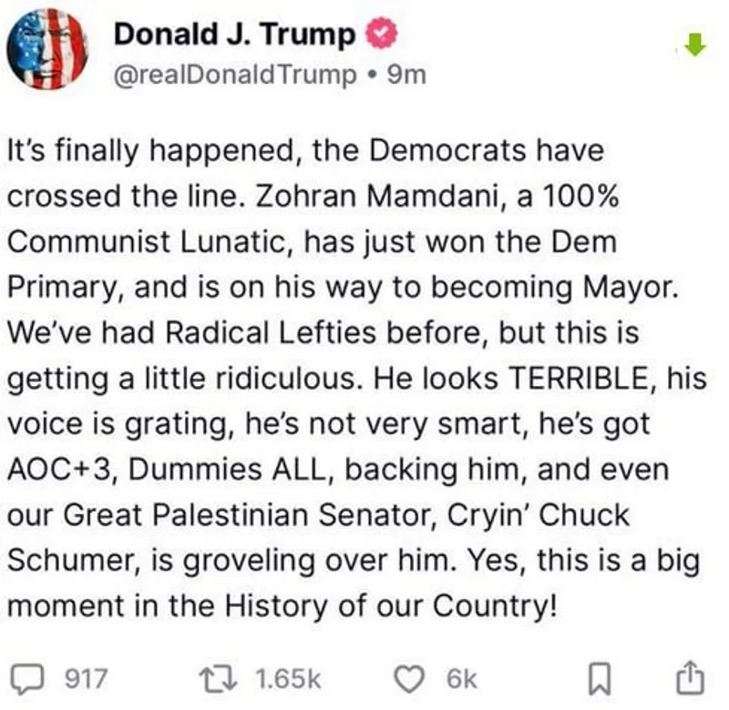 Но вот главный сюжет: в Нью-Йорке действует рейтинговое голосование, а значит, победитель еще не определен и впереди несколько раундов подсчета голосов. Трамп высказался по этому поводу на своем персональном интернет-ресурсе Truth Social.