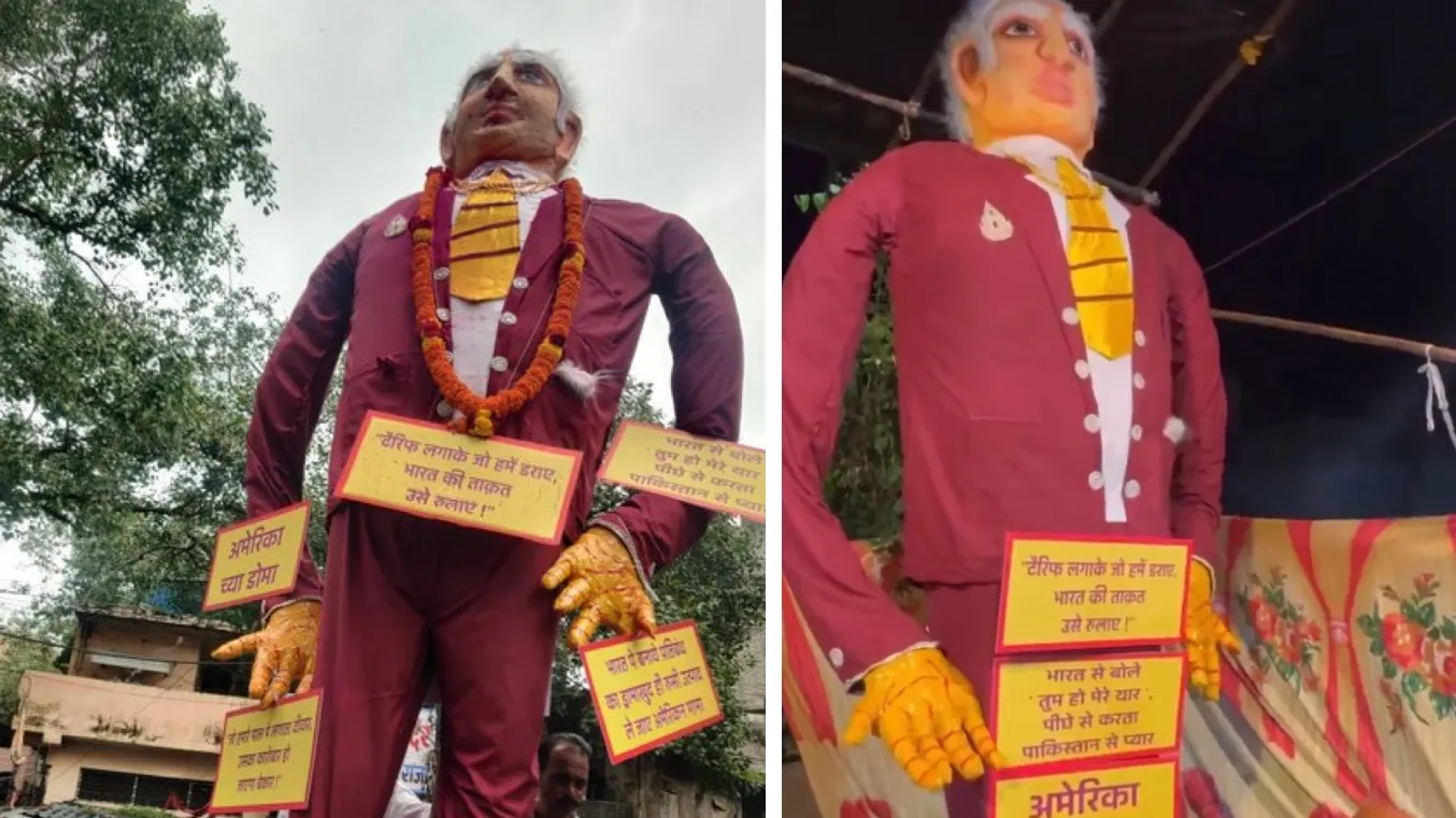 #WATCH | Nagpur, Maharashtra | A giant effigy of US President Donald Trump became the highlight of the centuries-old Marbat festival as people symbolically expressed their protest over US sanctioning 50% tariff on India. pic.twitter.com/KoXNaPj846