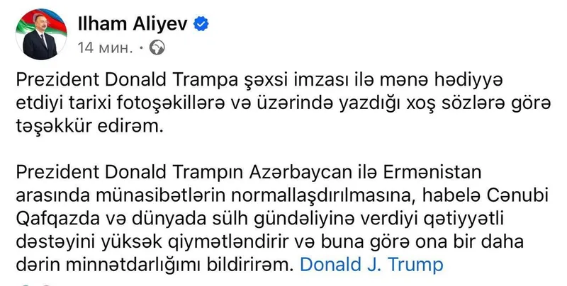 На своих официальных страницах в социальных сетях глава Азербайджана назвал их историческими, поскольку они с личной подписью Трампа.