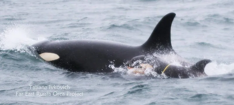 На Камчатке не могут спасти застрявшего в мусоре детеныша косатки