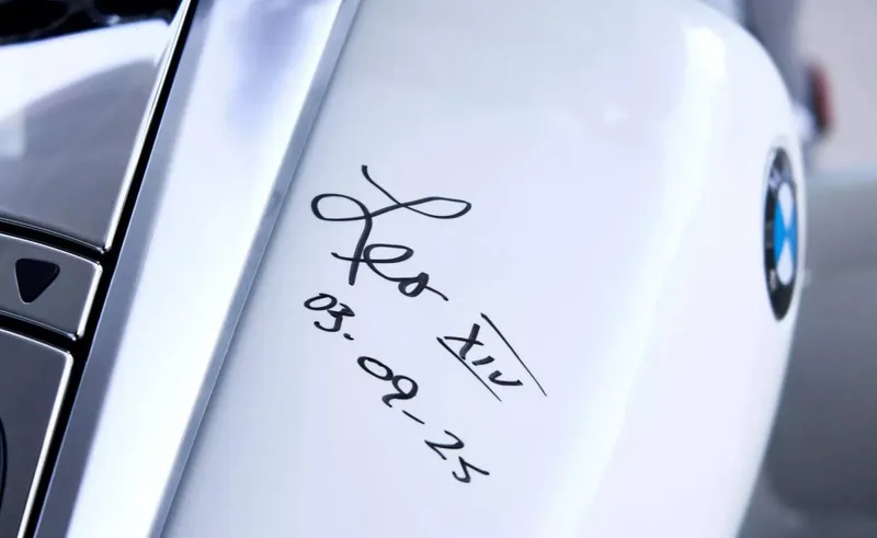 Мотоцикл украшен множеством других папских атрибутов, включая бирку, посвященную Папе Льву XIV, на блоке двигателя, надпись "peace" на верхнем кофре и уникальное белое кожаное сиденье. На баке присутствует его подпись.