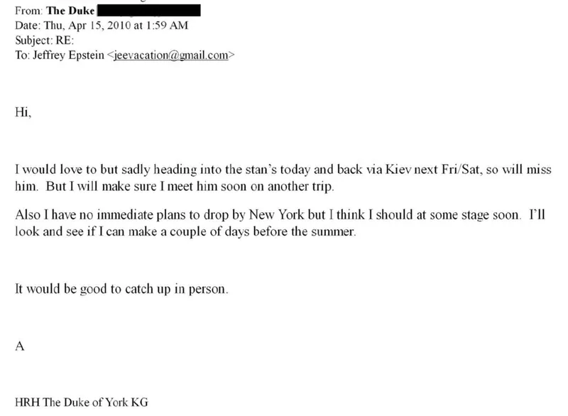 Из писем следует, что в апреле 2010 года Эпштейн написал Эндрю с предложением встретиться с американским банкиром Джесом Стейли в Лондоне. Тогдашний принц ответил, что будет за границей, но добавил, что "было бы здорово встретиться лично", и пообещал попытаться "выбраться на пару дней до лета", пишет Sky News.