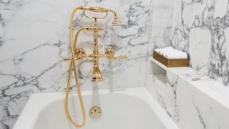 Там, где раньше зеленая плитка ар-деко напоминала о 1940-х годах, теперь сияет черно-белый мрамор, а все смесители – золотые. Над раковиной висит зеркало в тяжелой золотой раме, с потолка свисает люстра. Даже мусорная корзина вычищена до блеска.