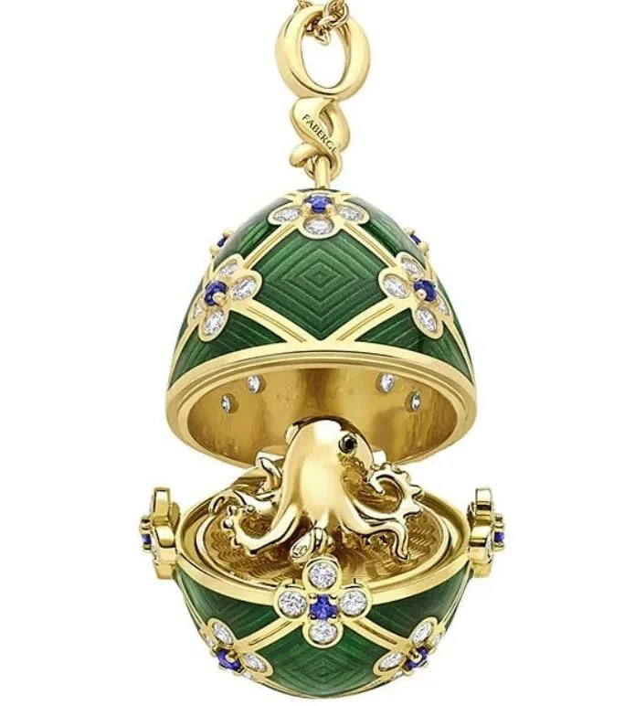 Кулон в форме яйца изготовлен из 18-каратного золота и украшен зеленой гильошированной эмалью. Украшение инкрустировано 60 белыми бриллиантами и 15 синими сапфирами. Внутри него находится миниатюрный осьминог с глазами из черных драгоценных камней.