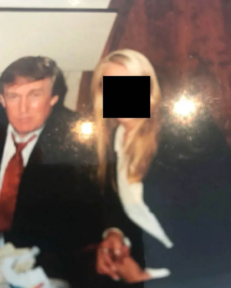 На первой фотографии президент США Дональд Трамп позирует с неизвестными женщинами, лица которых демократы решили скрыть.