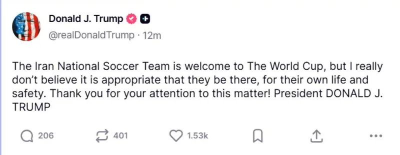"Футбольная сборная Ирана приветствуется на чемпионате мира, но я действительно не верю, что их присутствие там будет уместным ради их жизни и безопасности", – написал Трамп.