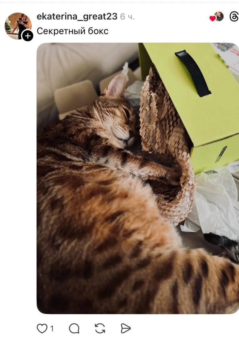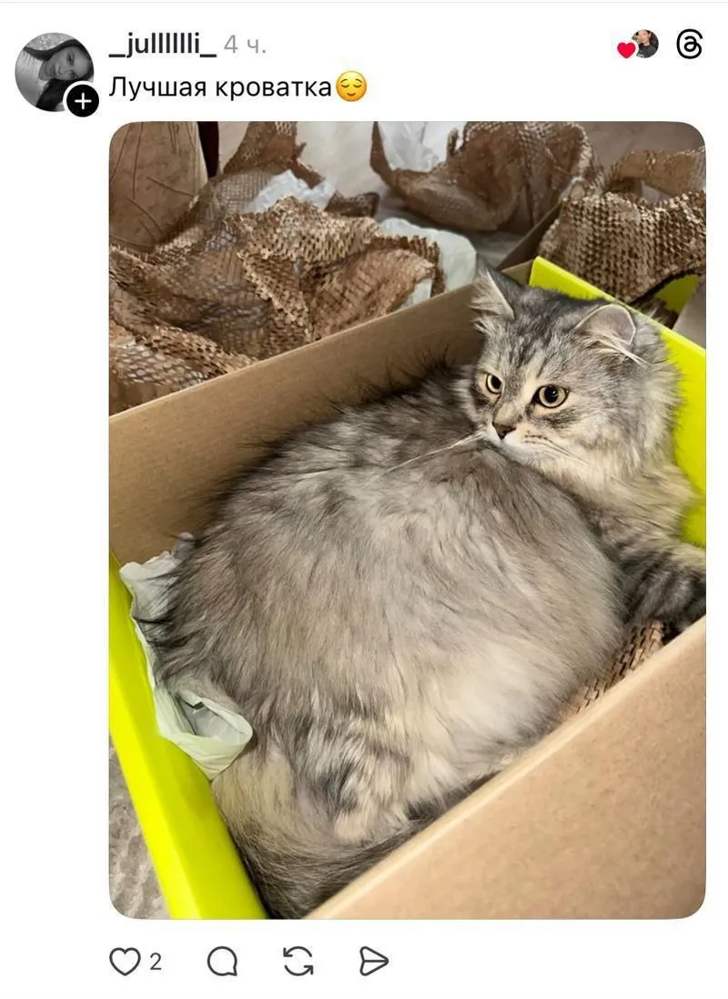Оказалось, что в них не помещаются их коты. Девушки устроили милейший флешмоб и делятся в социальной сети Threds фотографиями мурчащих "посылок".