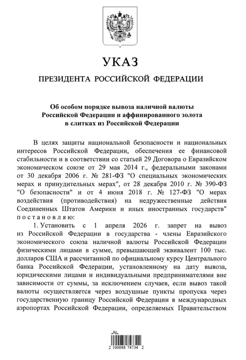 С 1 апреля 2026 года россиянам нельзя будет вывозить в страны Евразийского экономического союза наличные на сумму более 100 тысяч долларов, сообщает Zakon.kz.