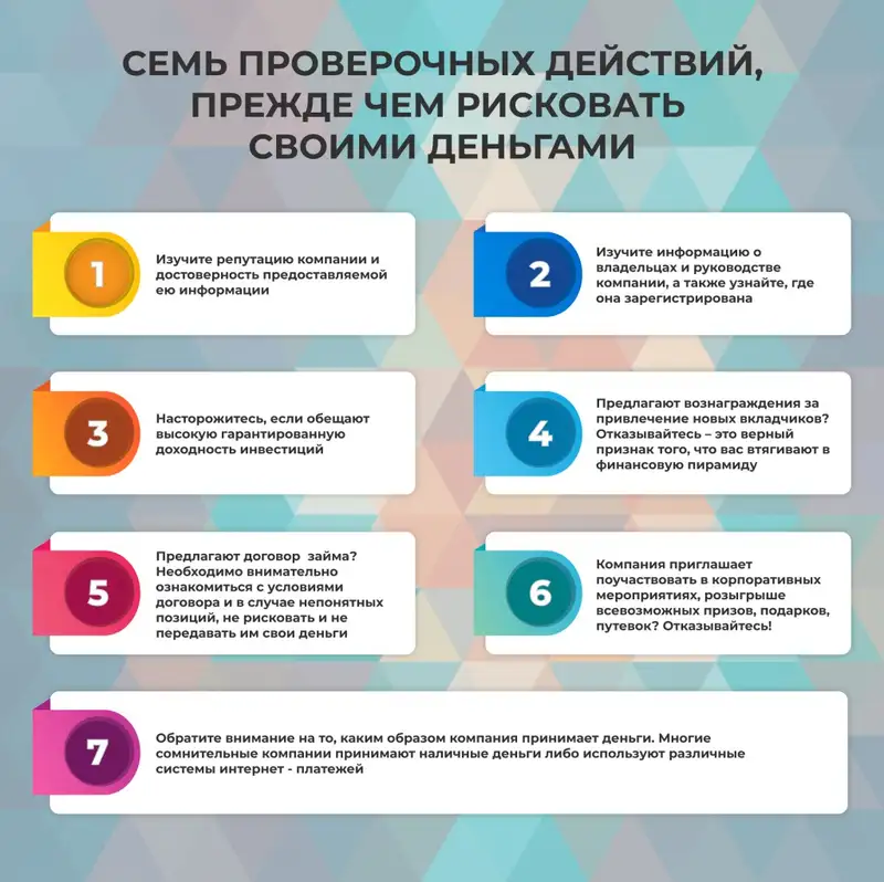 Внимательно читайте любой финансовый документ, особенно договор. Ничего не подписывайте, не разобравшись. Прежде чем расстаться со своими деньгами, подумайте о том, кому вы их отдаете и на какие цели. Если в организации, которой вы хотите доверить свои средства, вы обнаружите все или несколько из перечисленных выше признаков, стоит задуматься, не пытаются ли вас втянуть в очередную финансовую пирамиду.