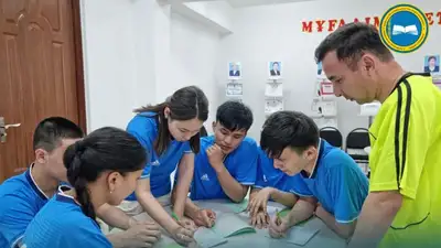 "На уроке, который проходит по правилам мини-футбола, шесть учащихся делятся на две группы и соревнуются. Команды могут заранее составить план и изменить его во время игры".Мукан Тулебаев