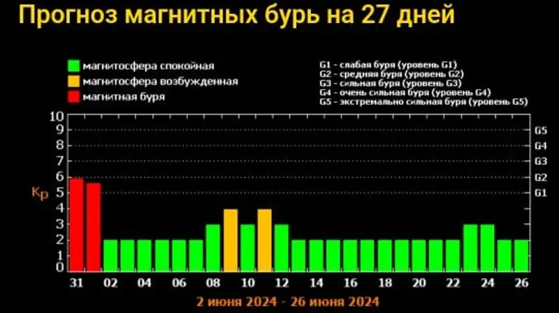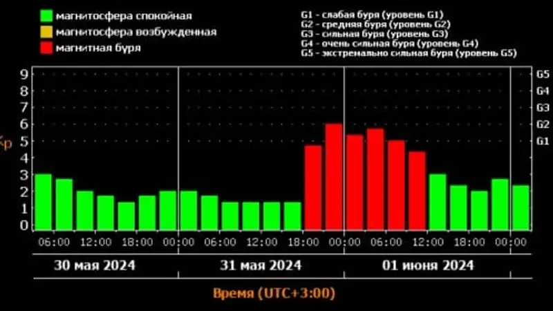 Согласно прогнозу Лаборатории, магнитная буря класса G2 начнется в ночь с 31 мая на 1 июня и продолжится до полудня.