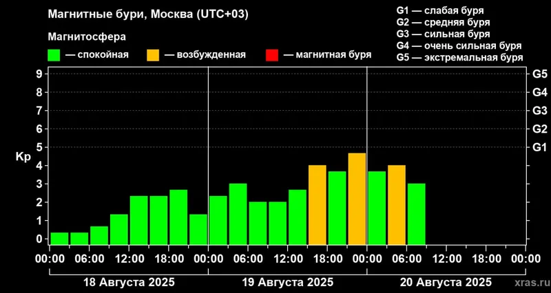 "Планета продолжает находиться в потоке возмущенной солнечной плазмы, связанном с действием наблюдающейся сейчас на Солнце корональной дыры. Скорость солнечного ветра находится последние часы в диапазоне 600-700 км/с, что примерно вдвое превышает нормальные значения. Из остальных параметров особенно сильно повышена температура окружающей Землю плазмы, которая в течение суток выходила на значения около полумиллиона градусов", – рассказали ученые 20 августа.