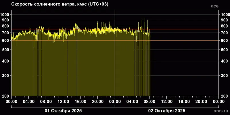 "По состоянию на начало дня отсутствуют какие-либо позитивные новости по стабилизации обстановки. Магнитный шторм, который начался еще утром во вторник (в ночь на 30 сентября. – Прим. ред.), с небольшими перерывами продолжается уже более 50 часов. Буря держится в диапазоне G1-G3, то есть большую часть времени находится на среднем уровне с отдельными сильными пиками".
